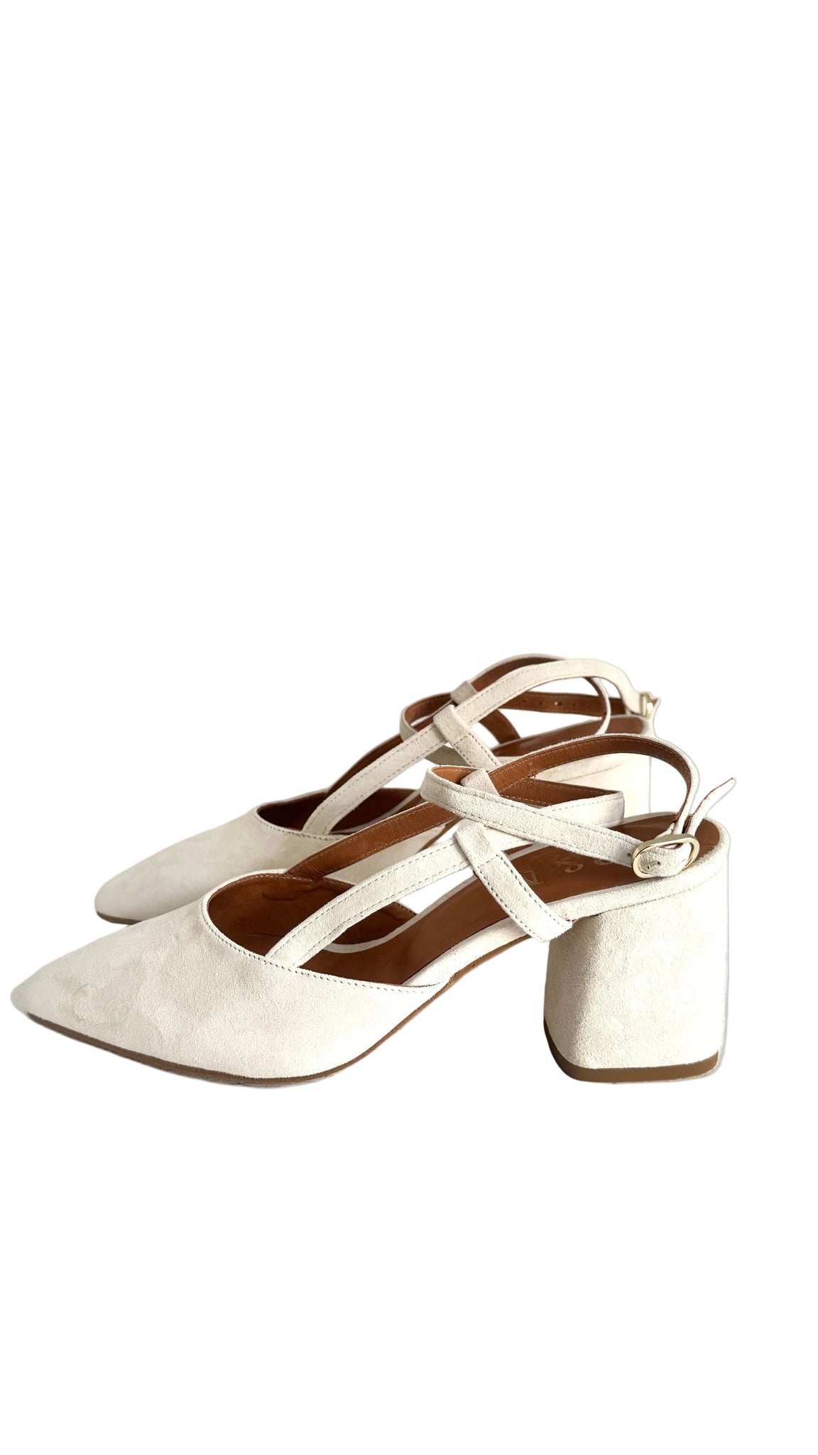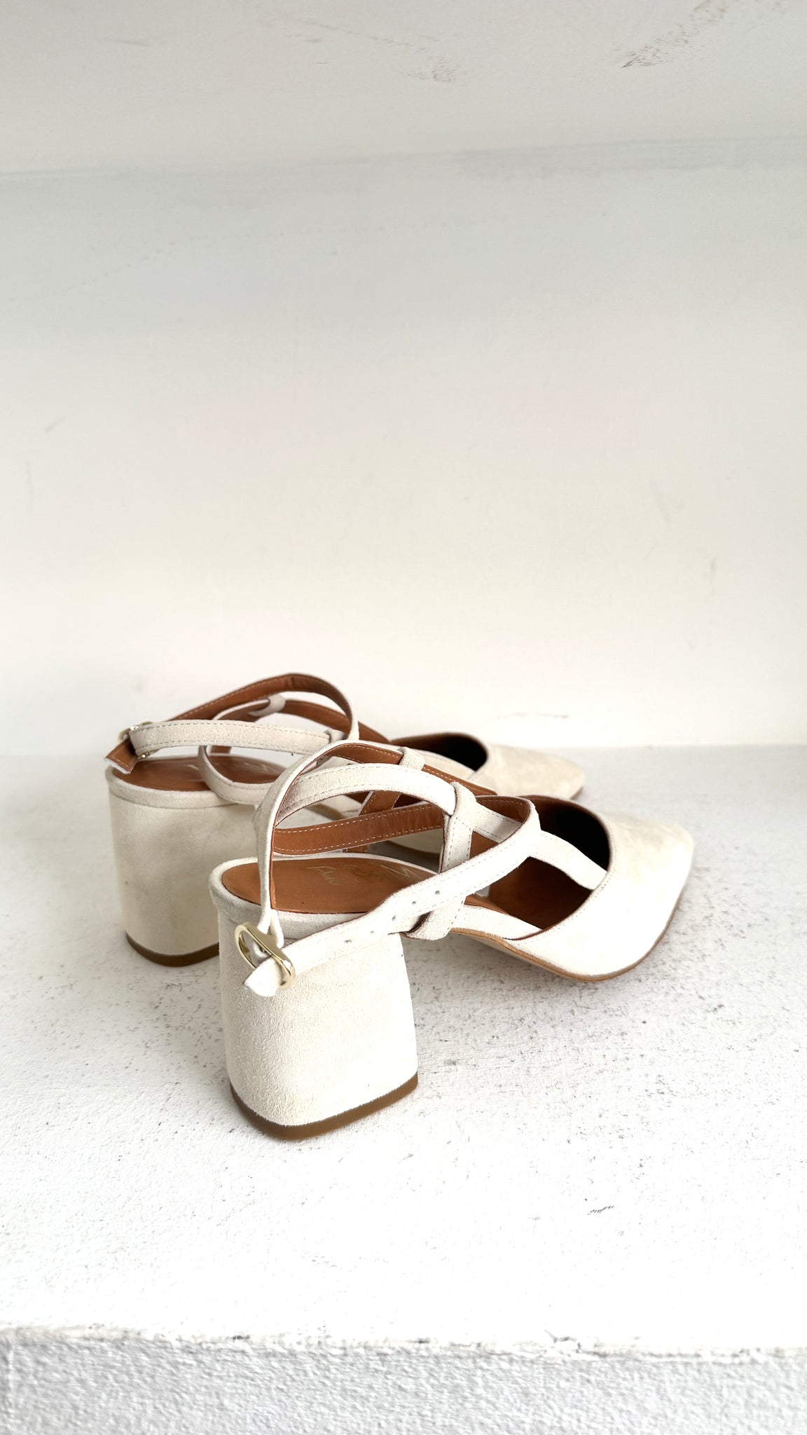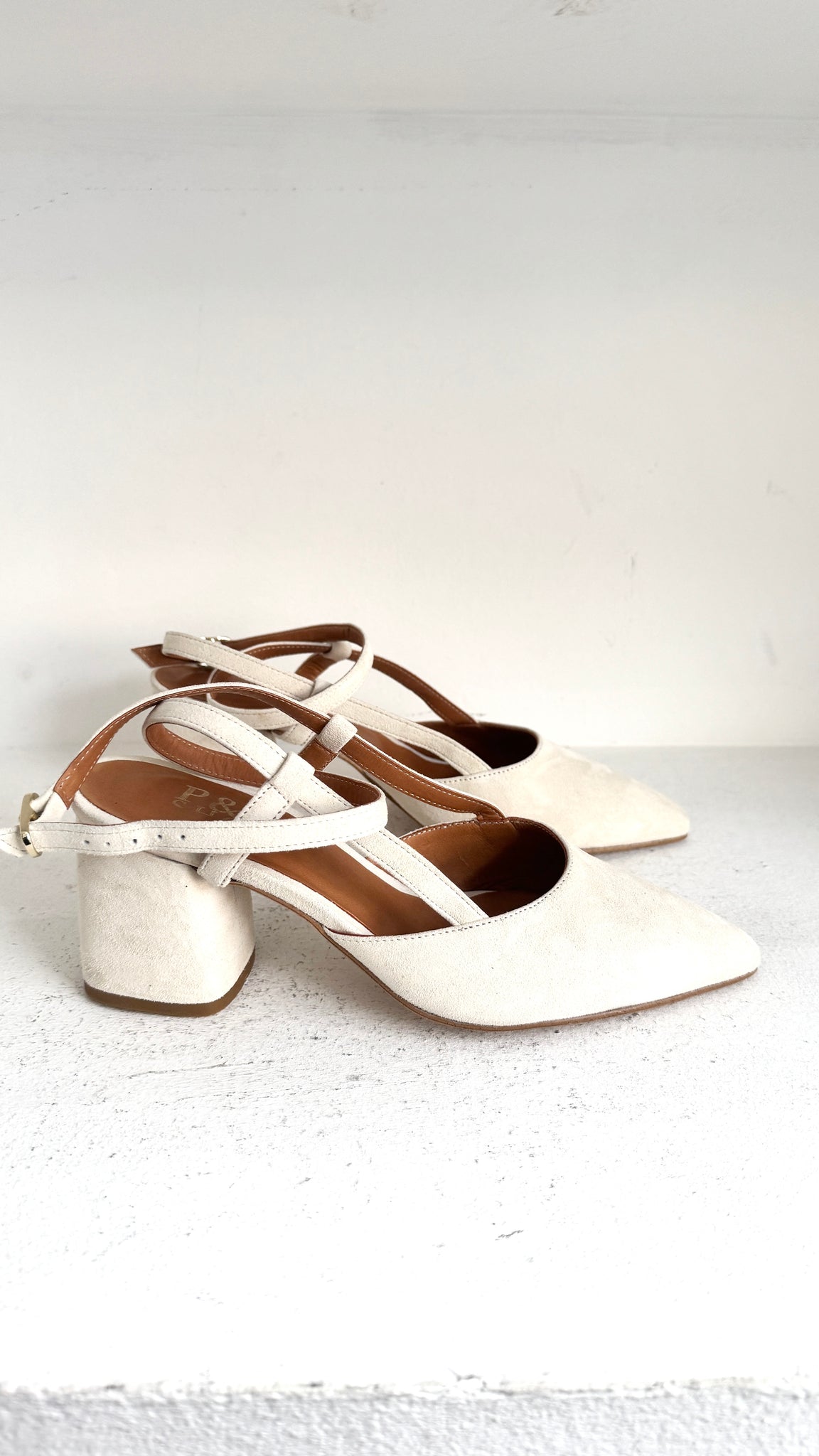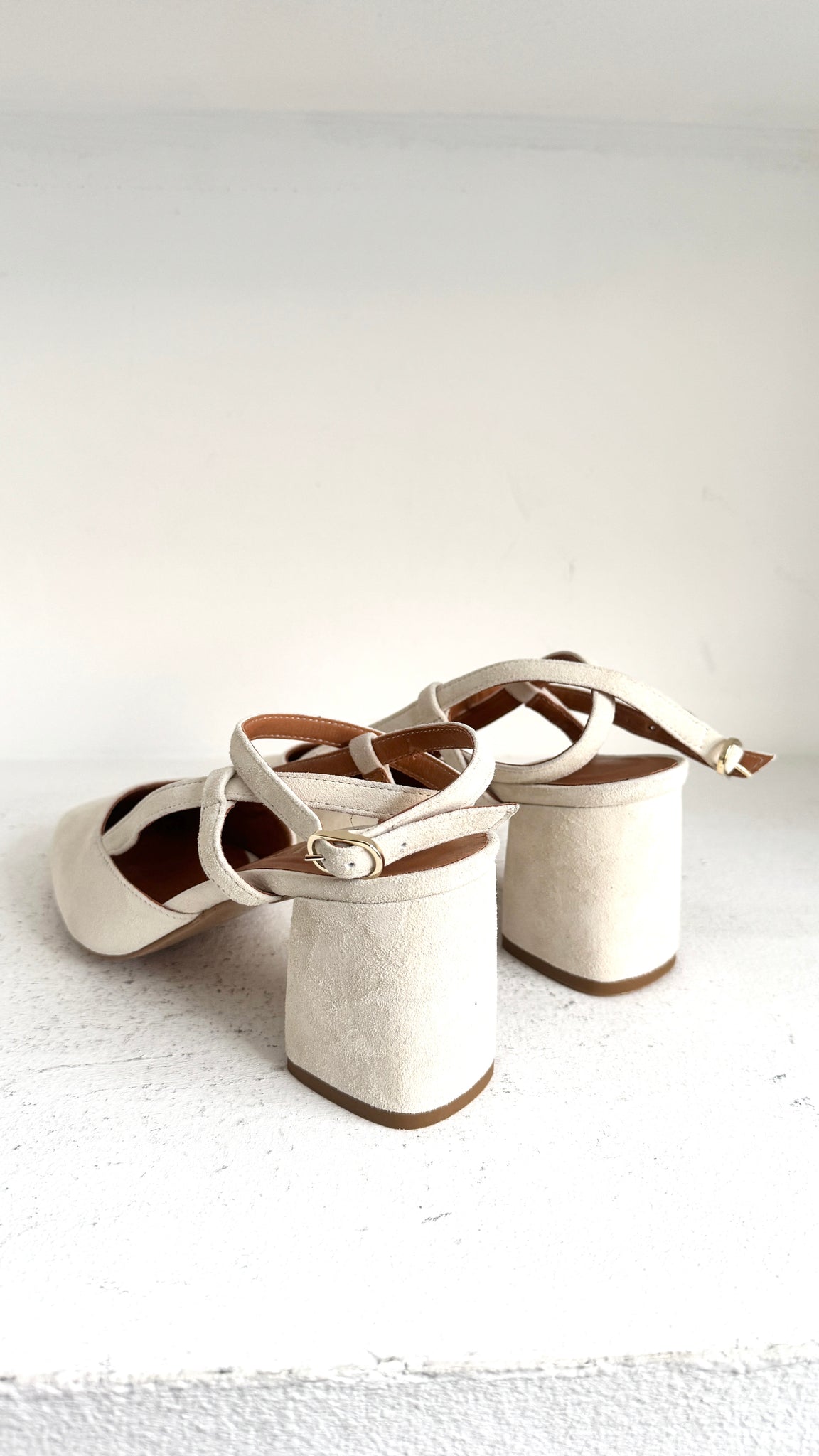 O modelo Marilyn Ankle Loop reinventa o clássico slingback com uma silhueta stiletto, disponível com salto fino ou grosso.