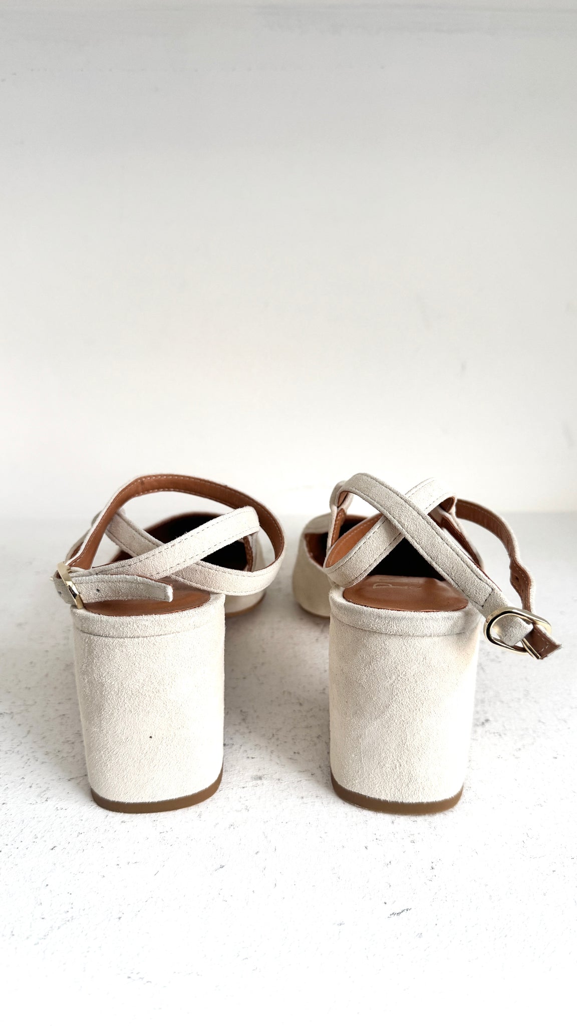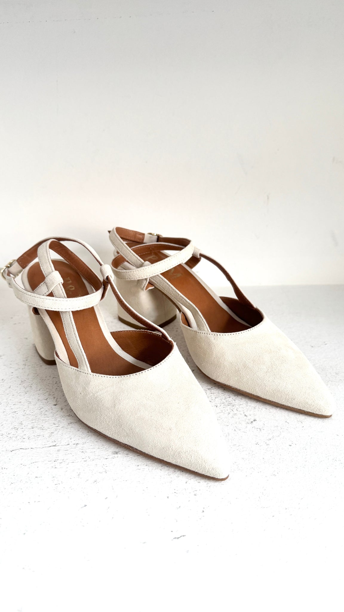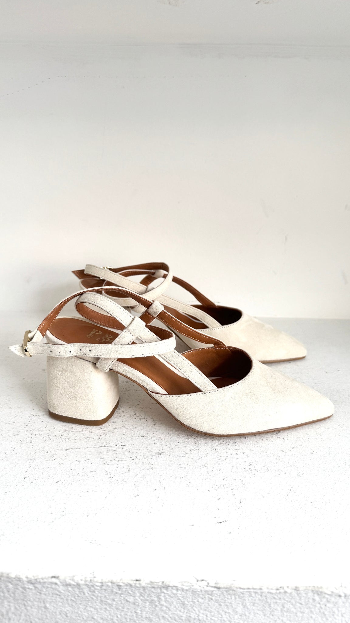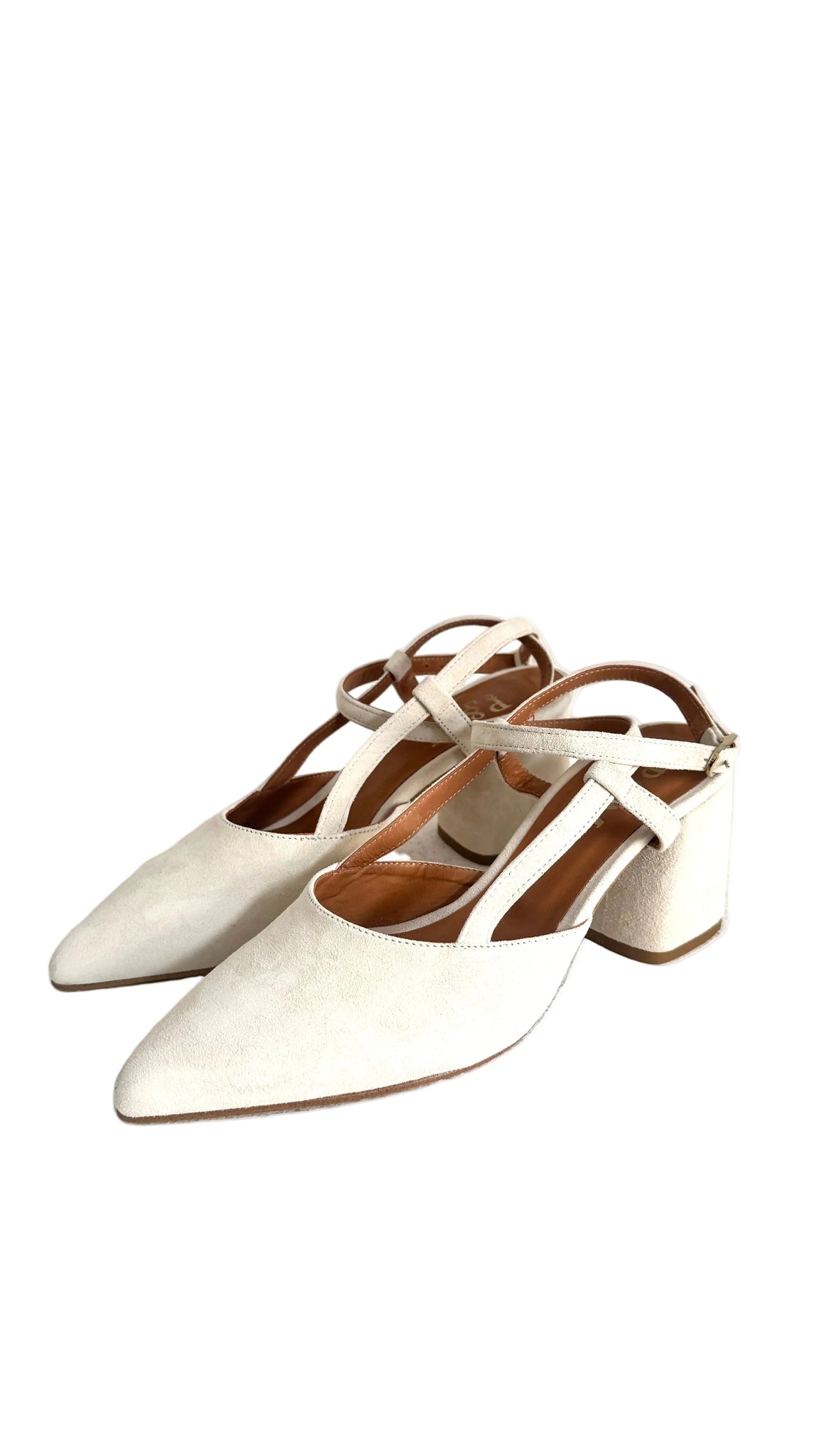 O modelo Marilyn Ankle Loop reinventa o clássico slingback com uma silhueta stiletto, disponível com salto fino ou grosso.